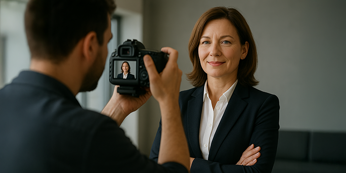 Rätt utsnitt. Rikta in kameran mot chefen och se till att du får lagom mycket av henne i utsnittet, typ överkroppen. Det är en smaksak, men oftast brukar man inte vilja att den som är intervjuad tittar rakt in i linsen. Så ställ dig en meter vid sidan av kameran och instruera henne att titta på dig i stället. För att hon inte ska glida ur filmrutan medan ni pratar kan det vara en idé att filma henne sittande.